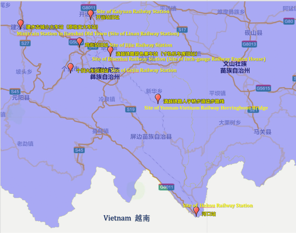 Map of the Gejiu-Bisezhai-Shibing Railway and the Yunnan-Vietnam Railway